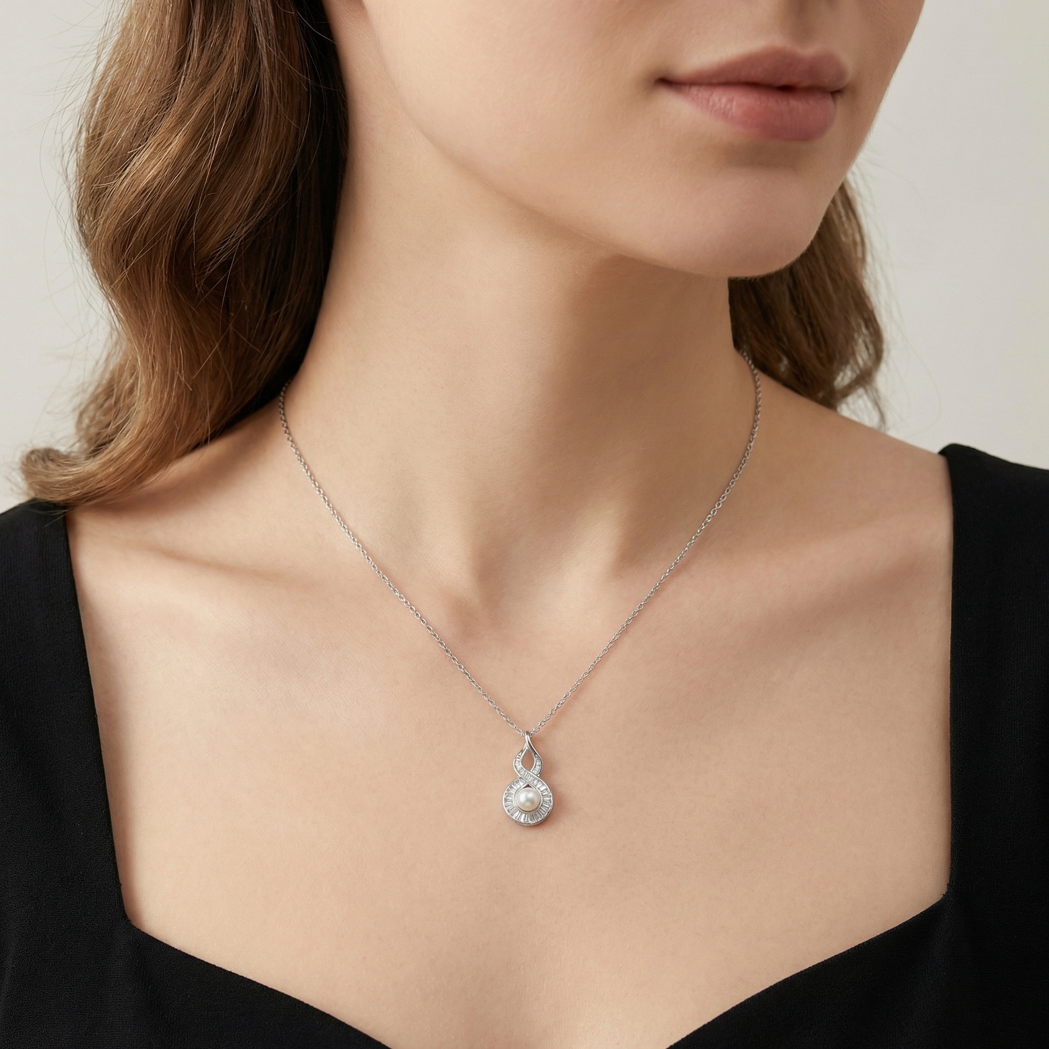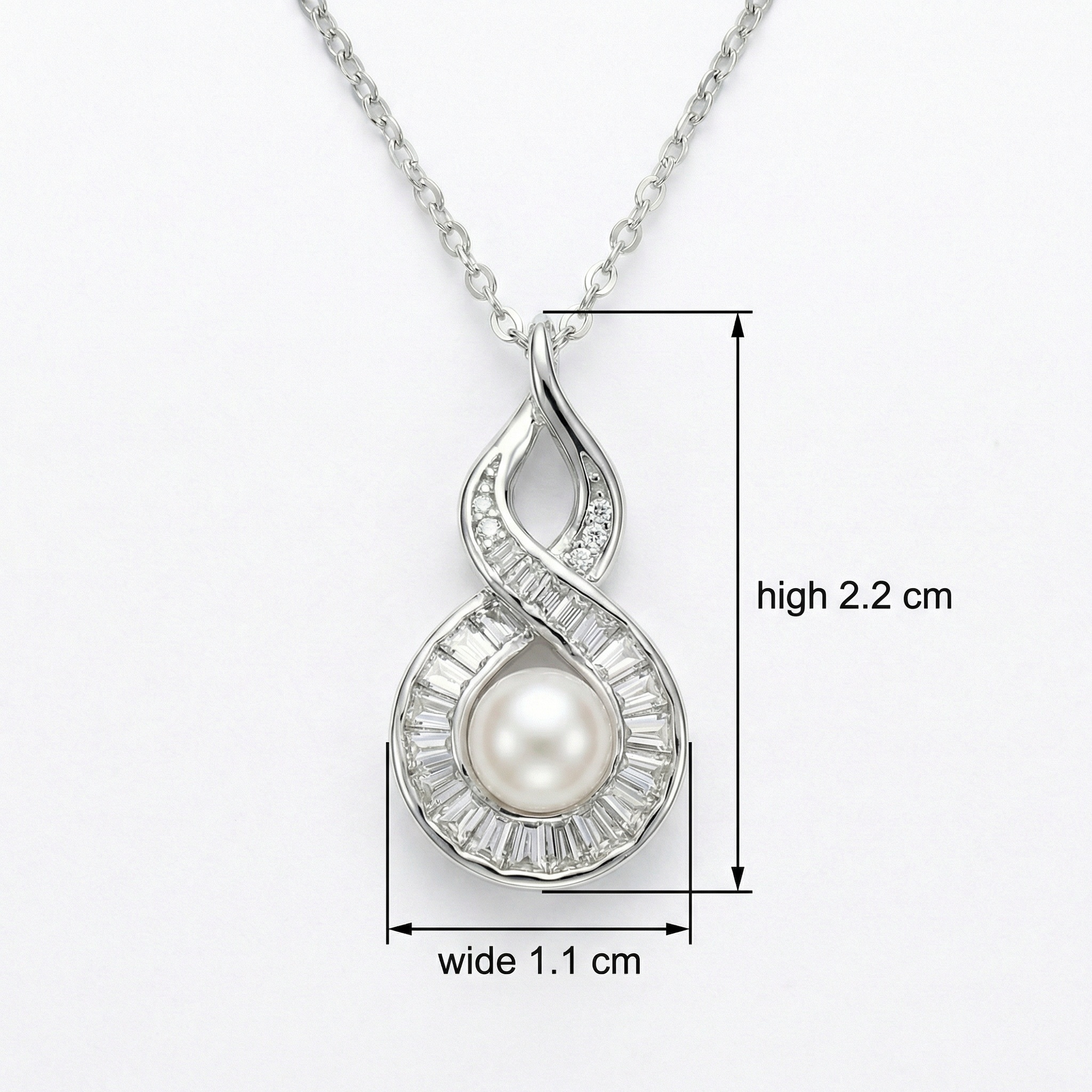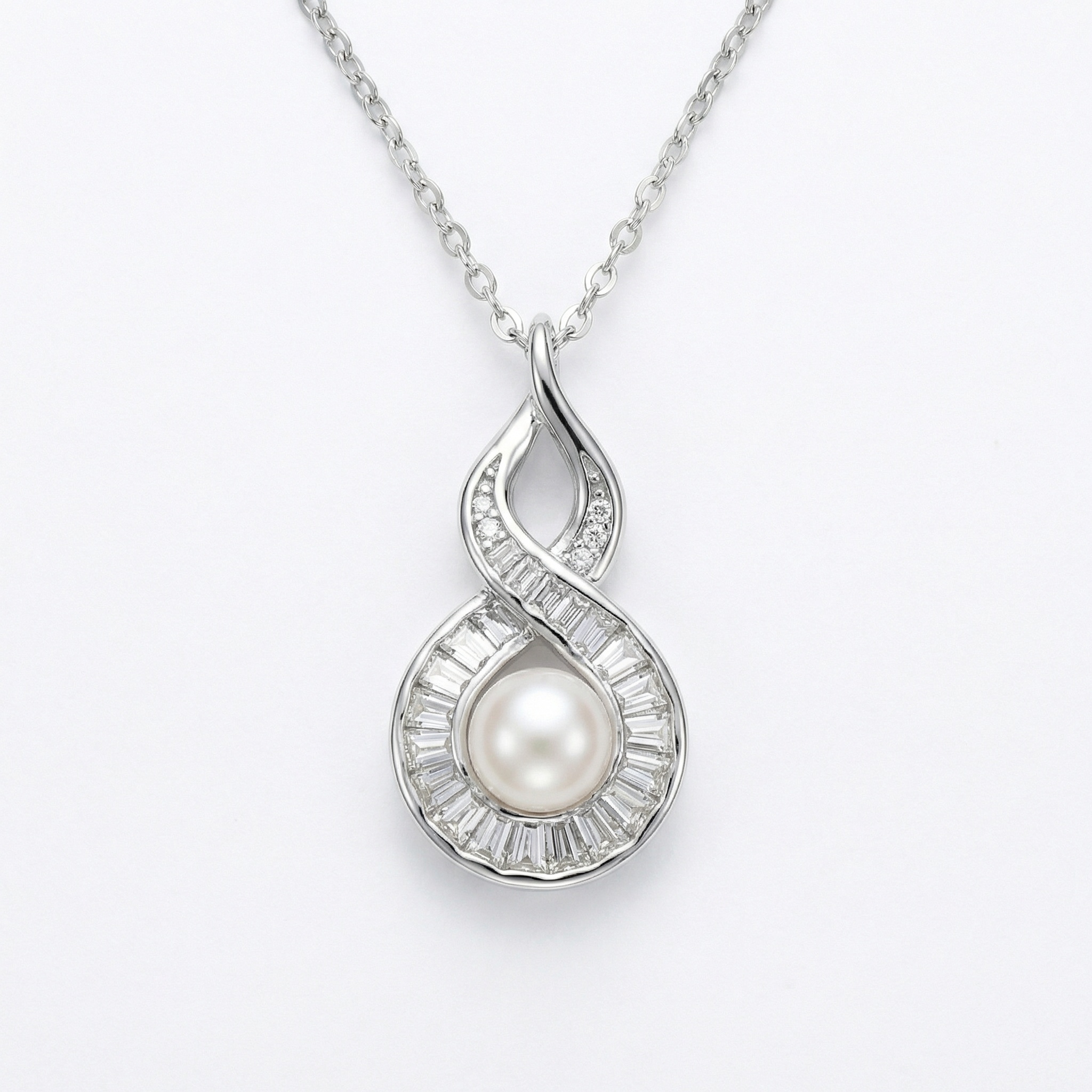 This exquisite necklace features a luminous white pearl at its center, cradled within a gracefully twisted teardrop pendant. Crafted from polished silver-toned metal, the design incorporates an infinity-inspired motif embellished with a brilliant array of channel-set baguette diamonds and shimmering round accents. The combination of the smooth, iridescent pearl and the architectural sparkle of the baguette stones creates a sophisticated and timeless aesthetic. Suspended from a delicate link chain, this piece is an ideal choice for formal occasions, bridal wear, or as a luxurious gift for someone special. Its refined craftsmanship and classic appeal ensure it remains a cherished staple in any jewelry collection. | Brand: jewelryodm