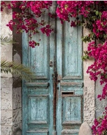 A detailed doorway surrounded by flowers creates a cozy and inviting composition full of charm.