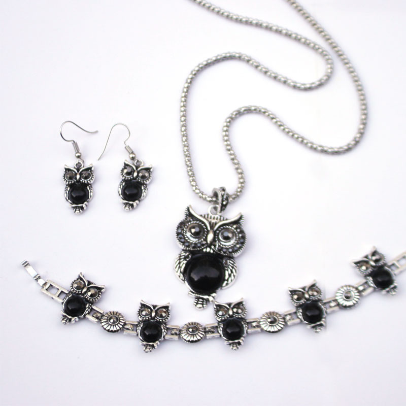 Vintage Turquoise Owl Necklace Earrings Bracelet Three-Piece Jewelry Set